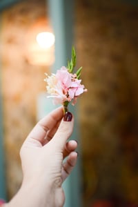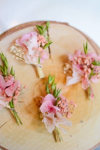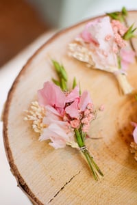Prendido para novio, padrino o más asistentes a conjunto del Ramo Carmina de nuestra web. Todos los prendidos se pueden personalizar con el ramo que más gusten. Incluye imperdible para enganchar en la solapa