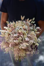 Ramo de flores secas y preservadas en tonos pastel con la paniculata rosa como protagonista